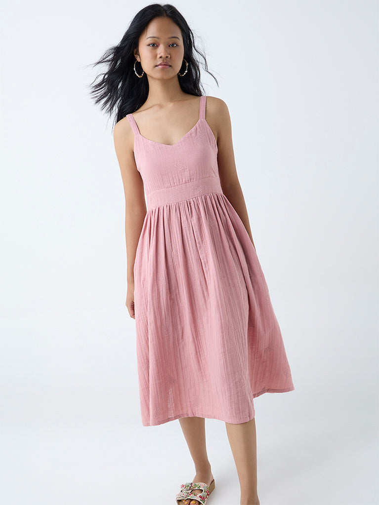 This dusty pink dress from Bombay Paisley is constructed from pure cotton with a self-textured finish. Shaped in a breezy A-line silhouette, it features a V-neck, adjustable shoulder straps, and a smocked back that ensures all-day comfort. A pocket at the side adds an element of functionality, while the dainty butterfly embroidery enhances its look.
