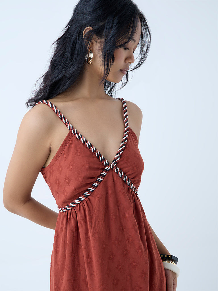 This brown dress from Bombay Paisley blends earthy elegance with artisanal detail. Constructed from a cotton-rich fabric in a breezy A-line silhouette, it features tonal embroidery that lends depth without overpowering the look. The plunge neckline is framed with interwoven cord accents and slim straps, offering a handcrafted edge to its refined design.