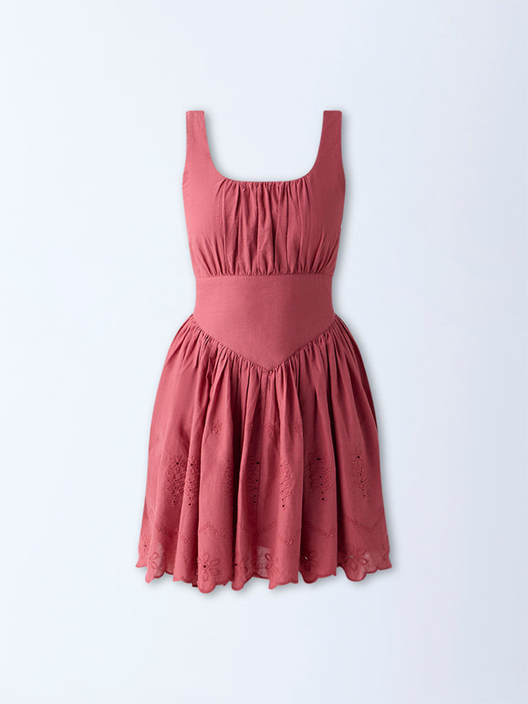 Sculpted in an A-line silhouette, this red dress from Bombay Paisley is fashioned with Swiss-dot embroidery throughout. Its pure cotton build ensures enhanced comfort, while the V-neck and adjustable straps make it a breezy choice for sunlit days and relaxed outings.