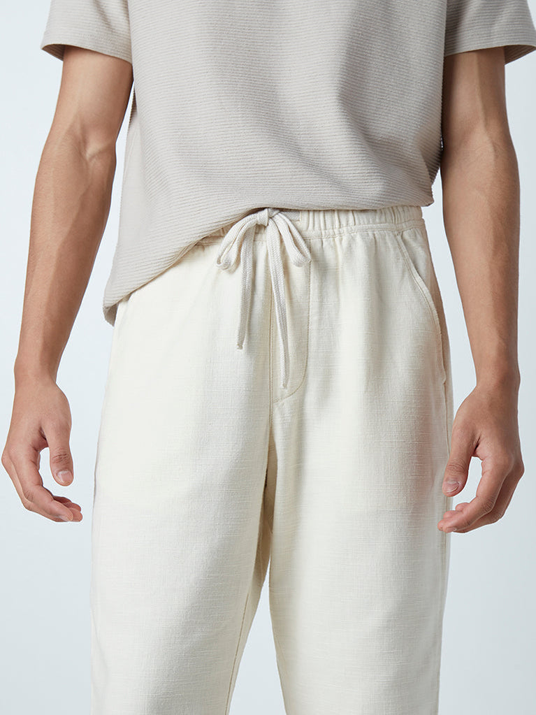Mid-rise chinos, self-patterned, relaxed fit, pockets, off-white hue, elastic waistband with adjustable drawstrings by ETA.