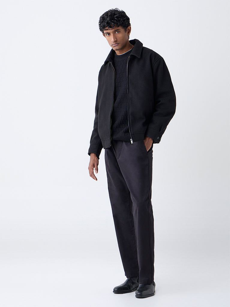 Get your dapper on with this black jacket from ETA, defined by a geometric embroidered exterior. Designed with a spread collar, a zipper front and full sleeves, it is balanced with dual welt pockets that add everyday utility. Cut from a pure cotton fabric with a lightweight feel, it stands out as a polished outerwear choice.