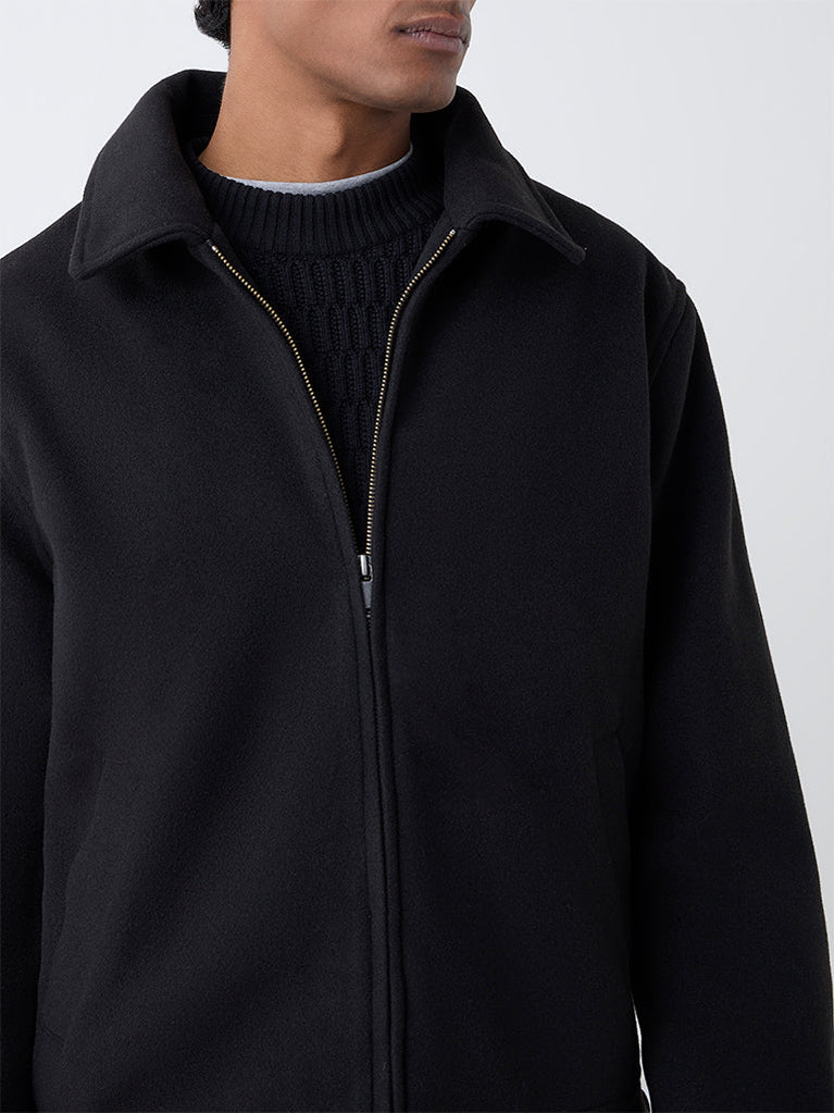 Ascot channels urban sophistication with this black suede jacket, where tactile richness meets modern utility. Styled with a sharp collar, zipper placket, and dual chest pockets, it balances structure and ease for a versatile smart-casual layer.