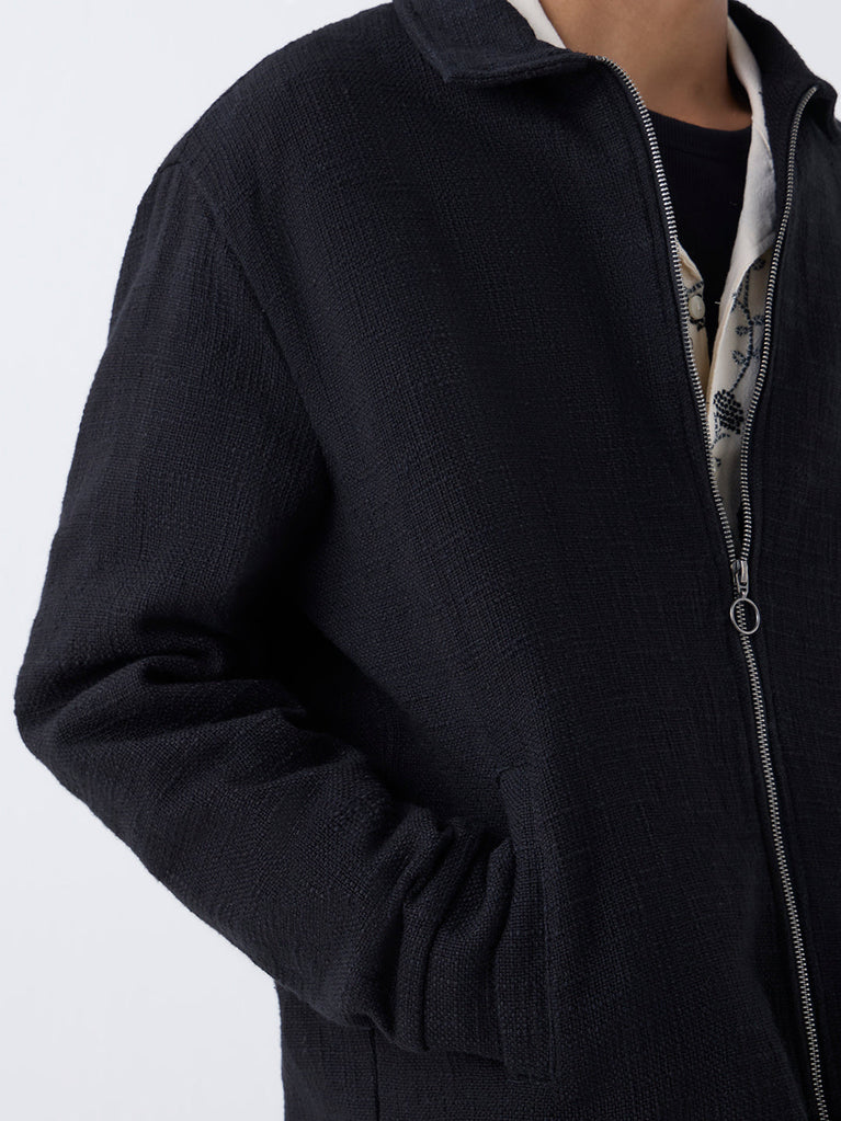 This black jacket by ETA is made from a cotton rich fabric in a tweed inspired weave, giving the surface a grounded, tactile feel. The relaxed structure keeps it easy to layer, while the structured collar, full sleeves and button up front establish a clean, considered outline. Front welt pockets reinforce its functional approach, creating a jacket that settles naturally into everyday rotation.