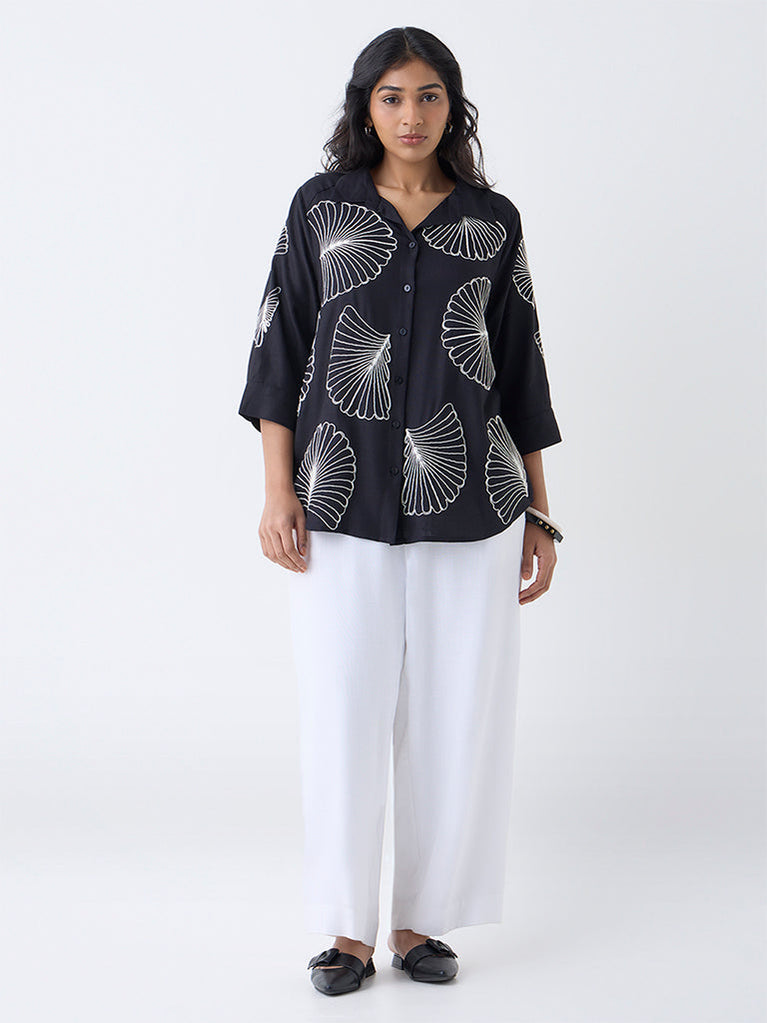 Elevate everyday dressing with this black shirt from Gia, detailed with intricate seashell embroidery across the front. Crafted from a breathable fabric, it features a classic collar, buttoned front and three-quarter sleeves. The relaxed silhouette offers a flattering drape that moves beautifully from desk to dinner.