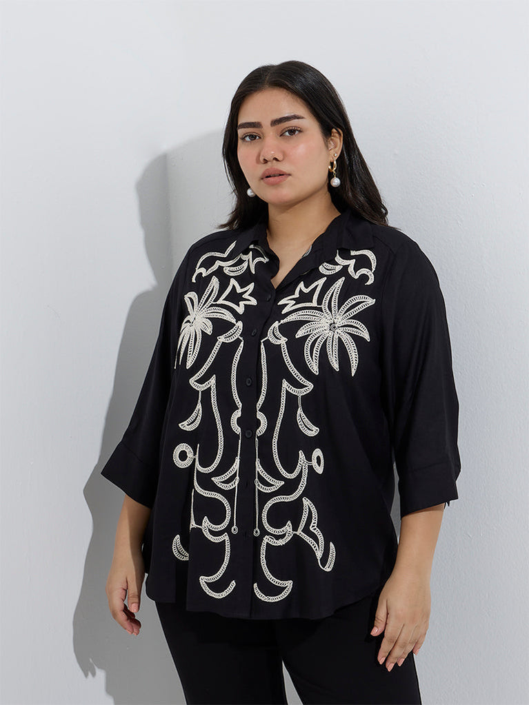 Spun from a lightweight fabric, this black shirt from Gia showcases intricate embroidery at the front for a touch of elegance. It’s styled with a spread collar, a button placket, and three-quarter sleeves.
