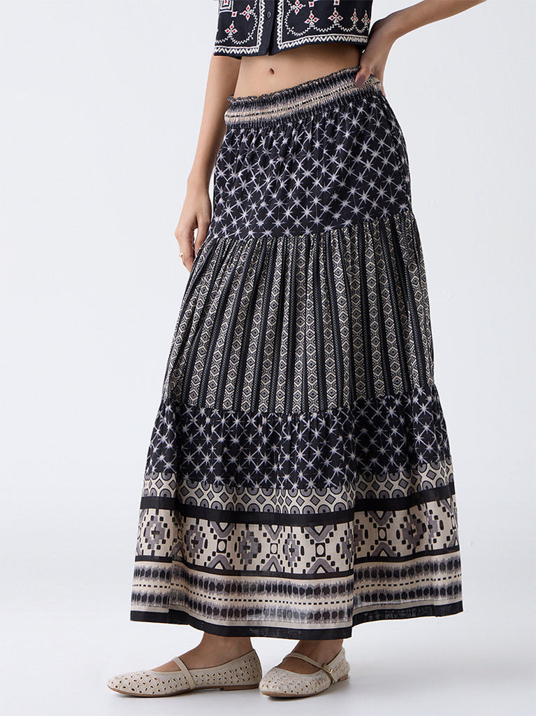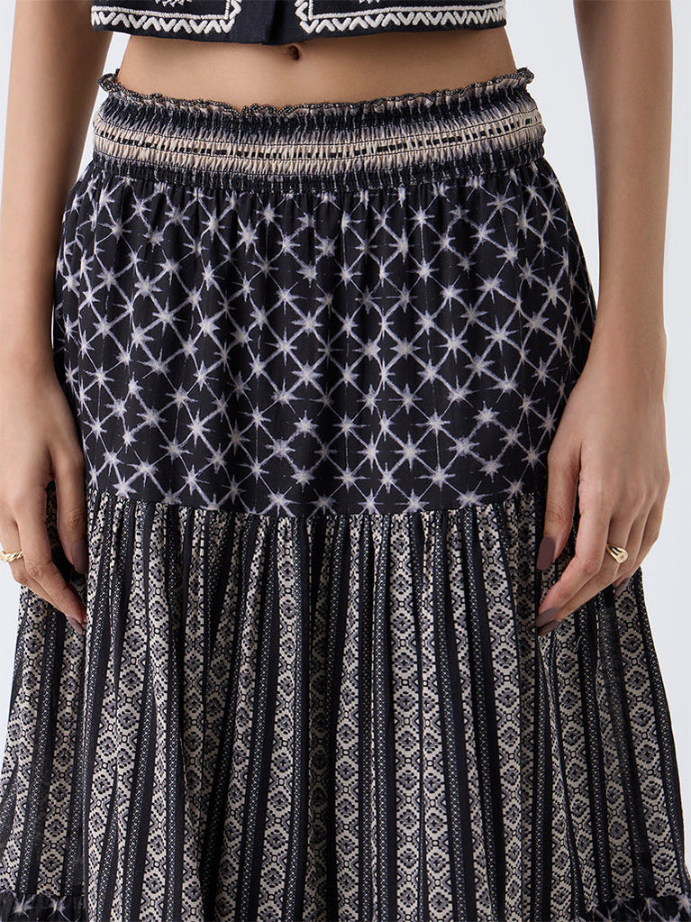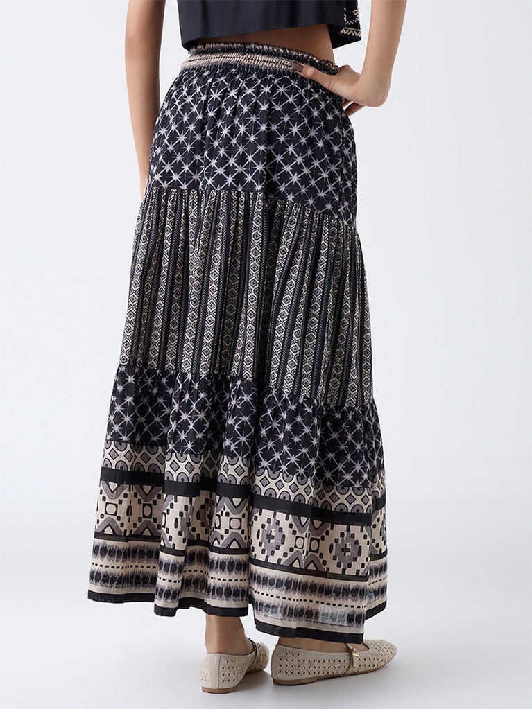 Bombay Paisley Black Printed Tiered Cotton Skirt