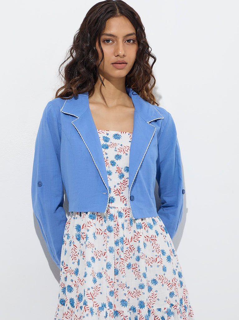 Bring a fresh flair to your summer wardrobe with this blue dress set from Bombay Paisley. Showcasing vivid floral patterns on a tiered silhouette, it is styled with a square neck, adjustable straps and a smocked back for easy wear. Crafted from pure cotton, it offers a soft, breathable feel. The matching jacket completes the set for a coordinated daytime look.