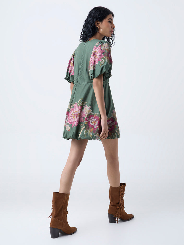 Ease into sunshine days with this sage cotton dress from Bombay Paisley. Cut in a breezy A-line silhouette, it’s elevated with vivid floral prints that bloom across its voluminous balloon sleeves and along the hem. The soft V-neckline frames the collarbone beautifully, while the concealed back zipper keeps it fuss-free.