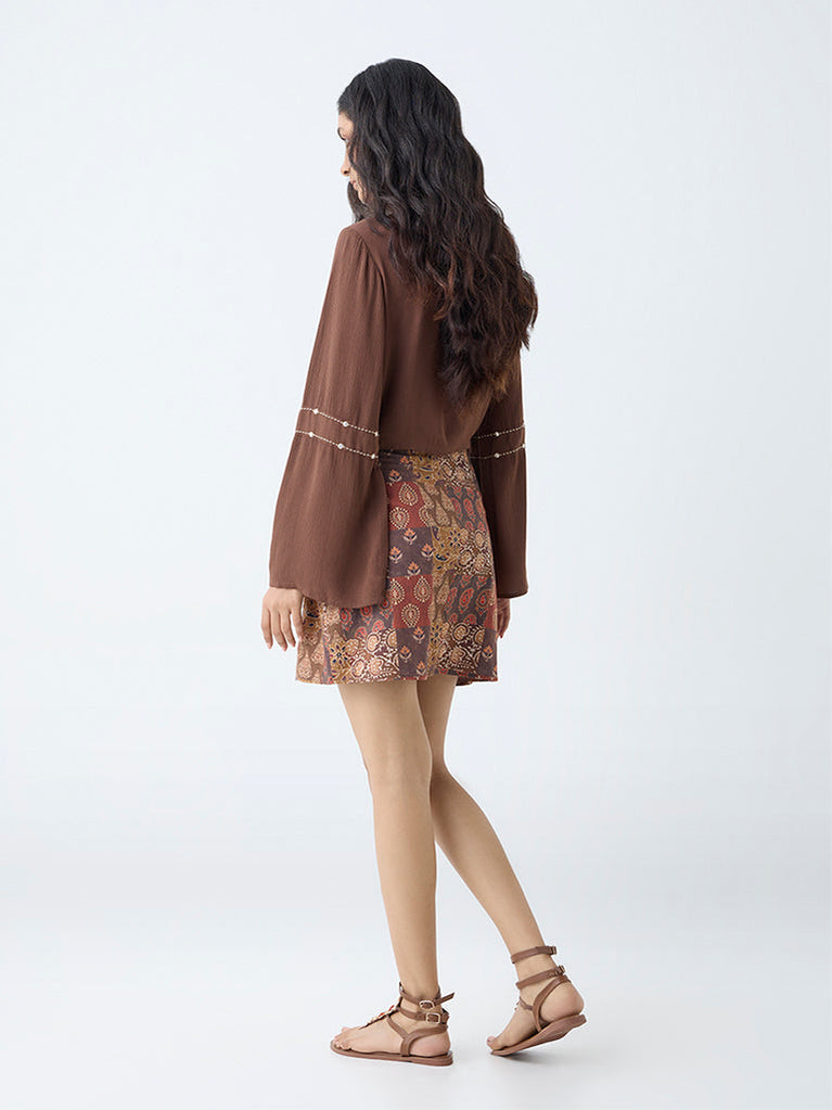 Enrich your off-duty style with this brown skirt from Bombay Paisley, adorned with vibrant block-pattern-inspired motifs that bring a touch of playful sophistication. Spun from pure cotton for enhanced comfort, it features an elasticated waistband and concealed zipper for effortless wear.