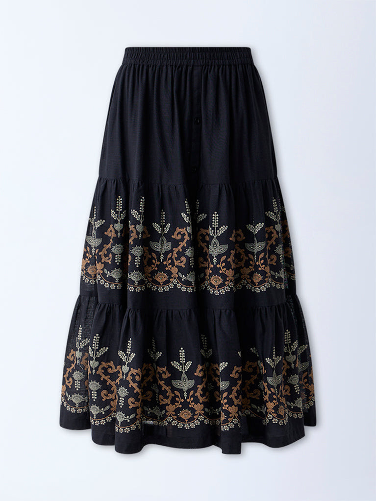 Shaped in a tiered silhouette, this black skirt from Bombay Paisley is detailed with floral motifs for added charm. Milled from a sumptuous fabric for all-day comfort, it is fitted with an elasticated waistband to ensure ease of wear.