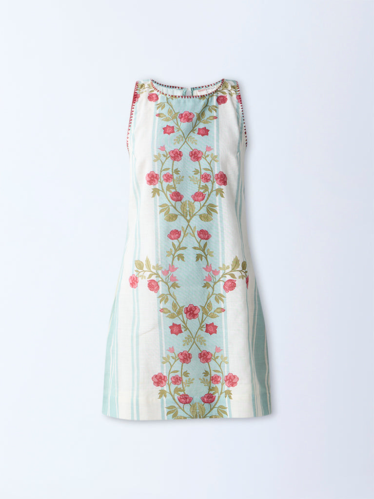 This off-white shift dress from Bombay Paisley spotlights delicate floral prints that adds charm to its minimal silhouette. Spun from pure cotton for easy comfort, it is styled with a round neck and a sleeveless cut, making it a versatile choice for warm-weather dressing.