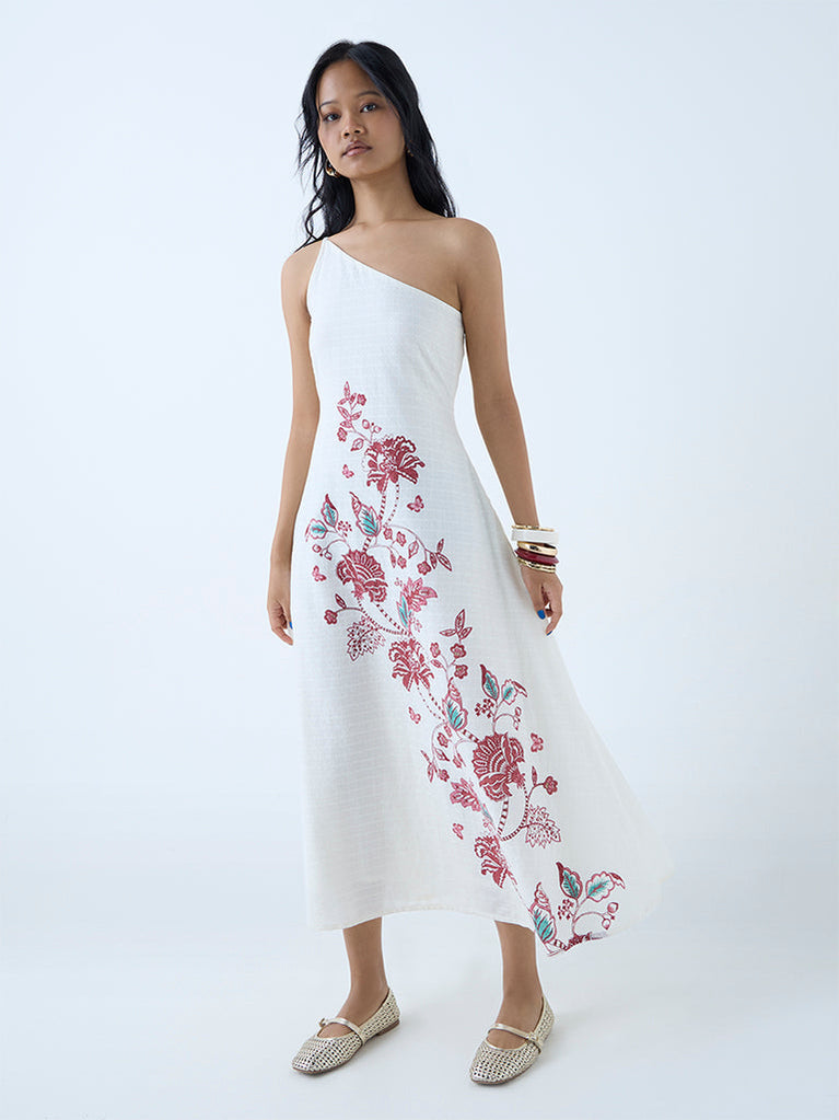 Bombay Paisley Off-White Floral Cotton One-Shoulder Dress