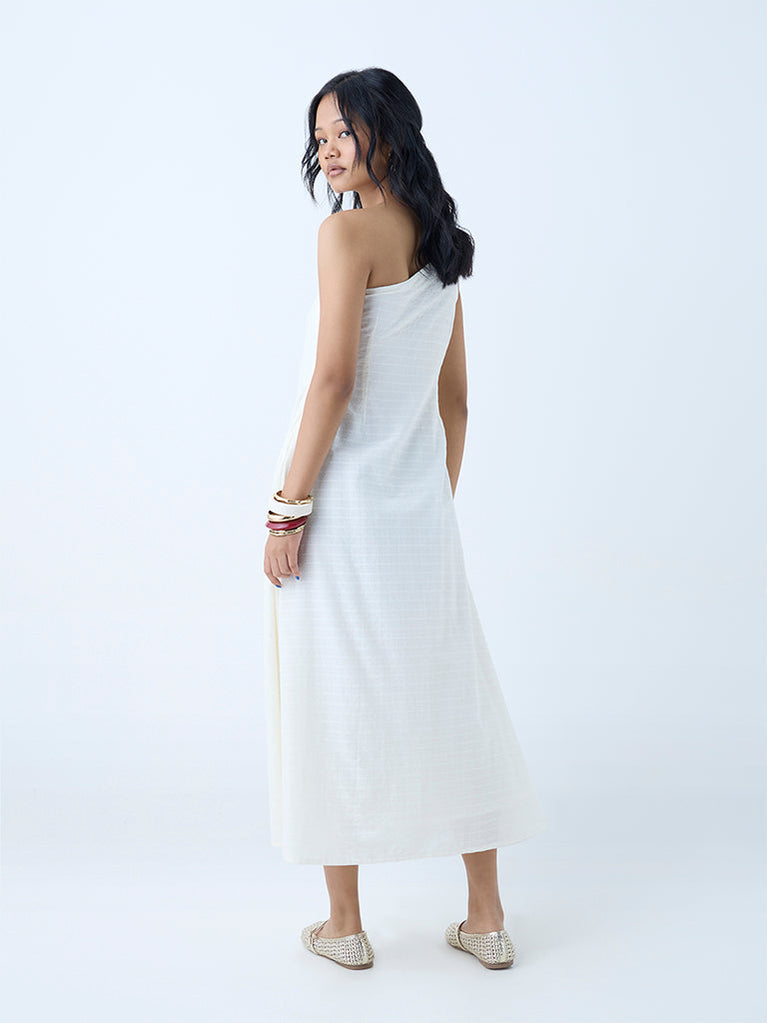 This off-white dress from Bombay Paisley showcases floral motifs that lend it a graceful charm. Milled from pure cotton, it’s cut in a breezy A-line silhouette and styled with a modern one-shoulder neck for a touch of contemporary flair. A concealed side zipper ensures a seamless fit, making it a refined choice for daytime occasions.