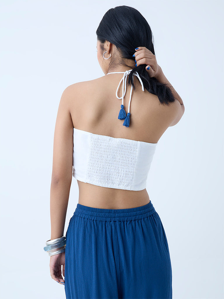 This white top from Bombay Paisley channels boho elegance with its exquisite floral embroidery on a soft cotton-blend base. The halter-neck silhouette ties at the back for a custom fit, while the smocked back ensures ease and comfort.