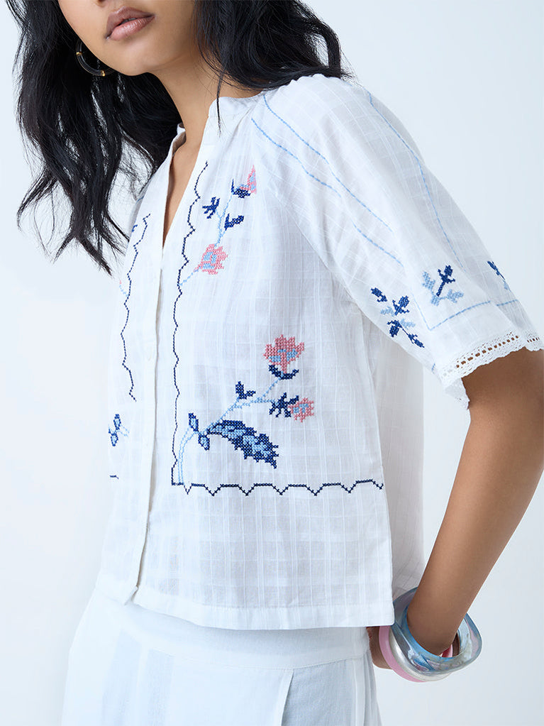 Bombay Paisley White Floral Embroidered Cotton-Blend Top