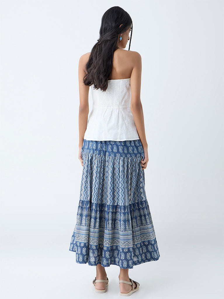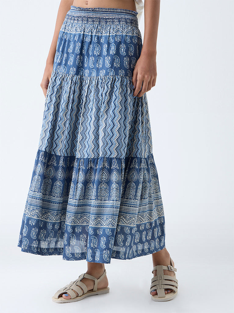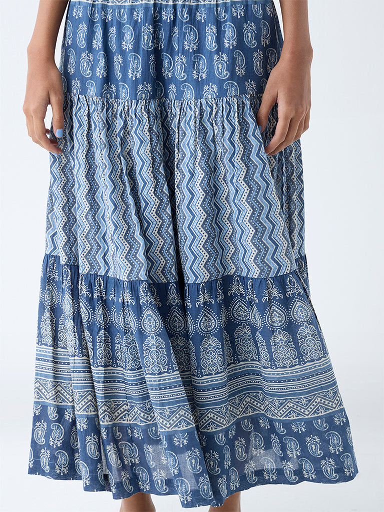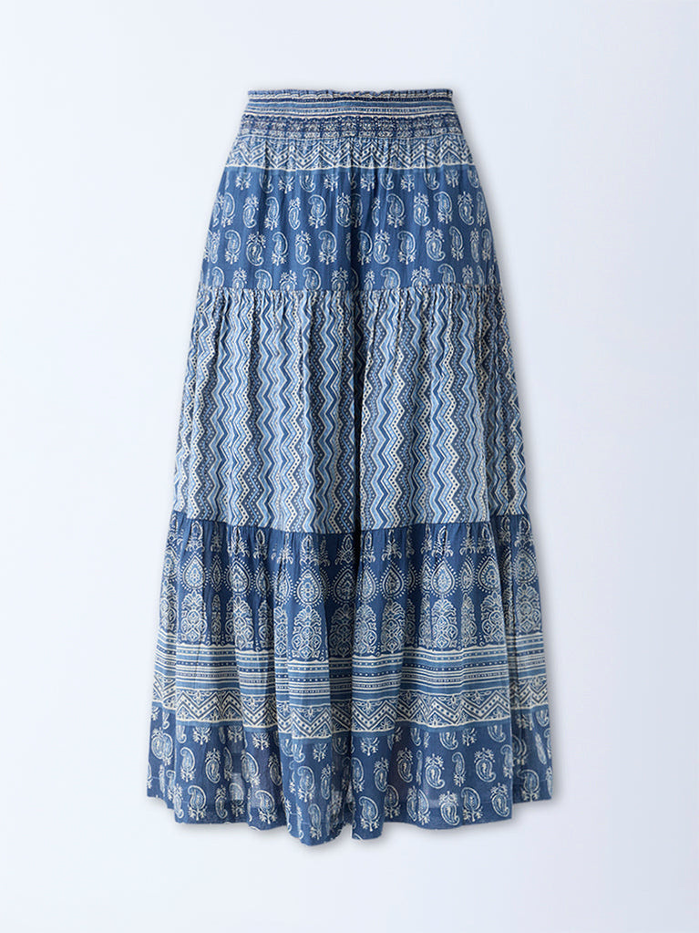 Bombay Paisley Indigo Printed Tiered Cotton Skirt
