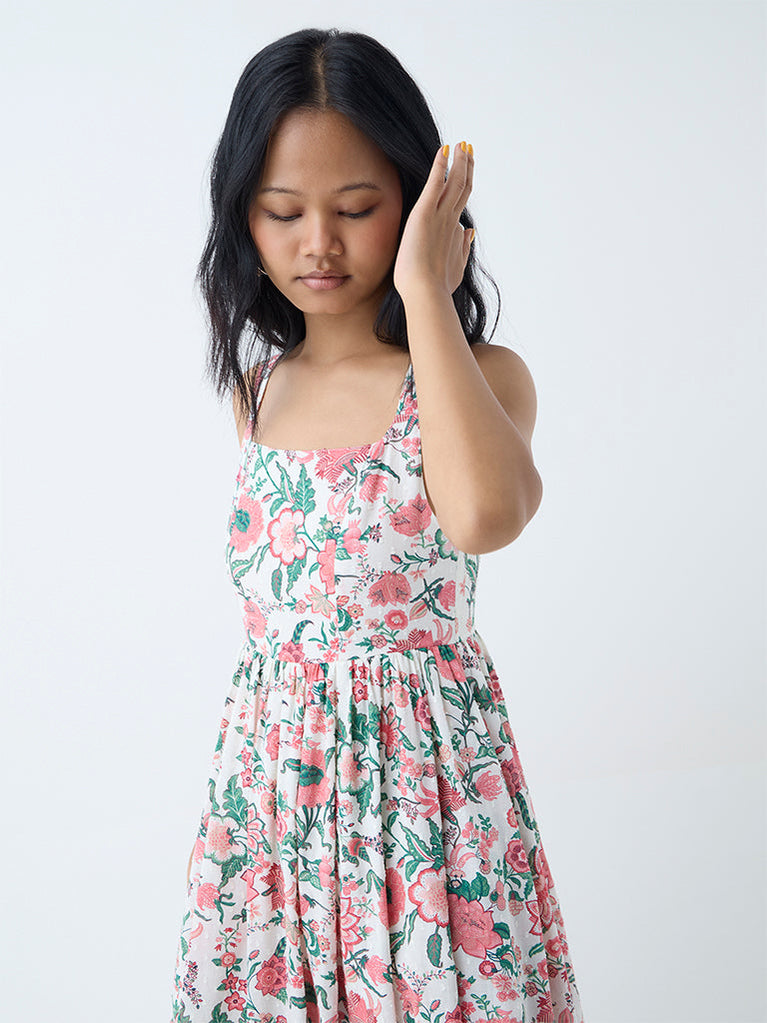 Shaped in A-line dress silhouette, this multicolour dress from Bombay Paisley brings a burst of vibrance with its lively floral print. Created from a rich cotton-blend fabric that offers enhanced breathability, it includes a square neck and adjustable shoulder straps for ease and balance. A concealed back zipper finishes the look with a tailored touch.