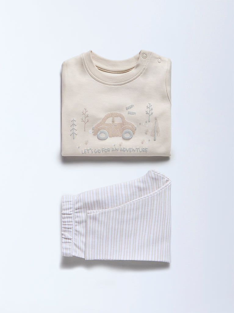 HOP Baby brings a beige co-ord set with a full-sleeve t-shirt detailed with embossed car prints for a playful, adventure-led look. Designed with a soft crew neckline to keep little ones comfortable through the day. Striped pants come with an elasticated waistband for a secure, easy-wear fit. Made from pure cotton to offer gentle warmth without compromising movement. A cosy, premium set built for crawling, cuddling and exploring.
