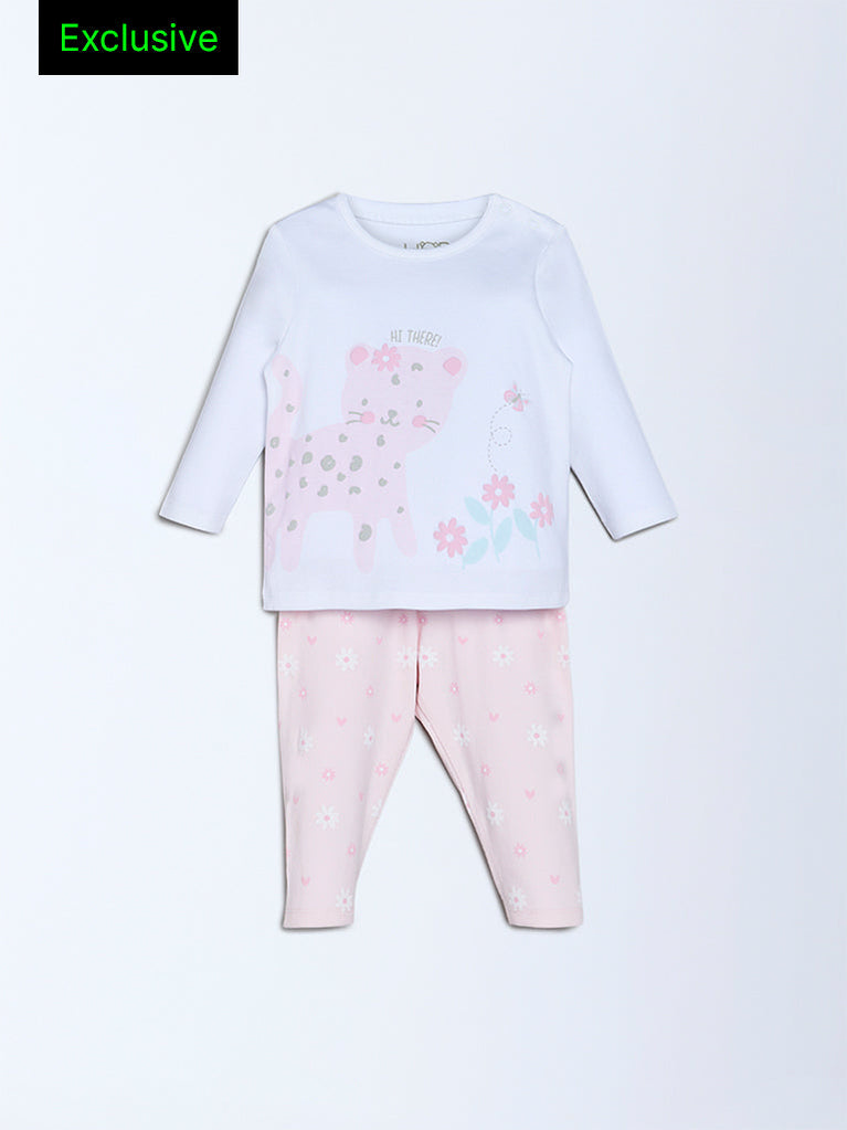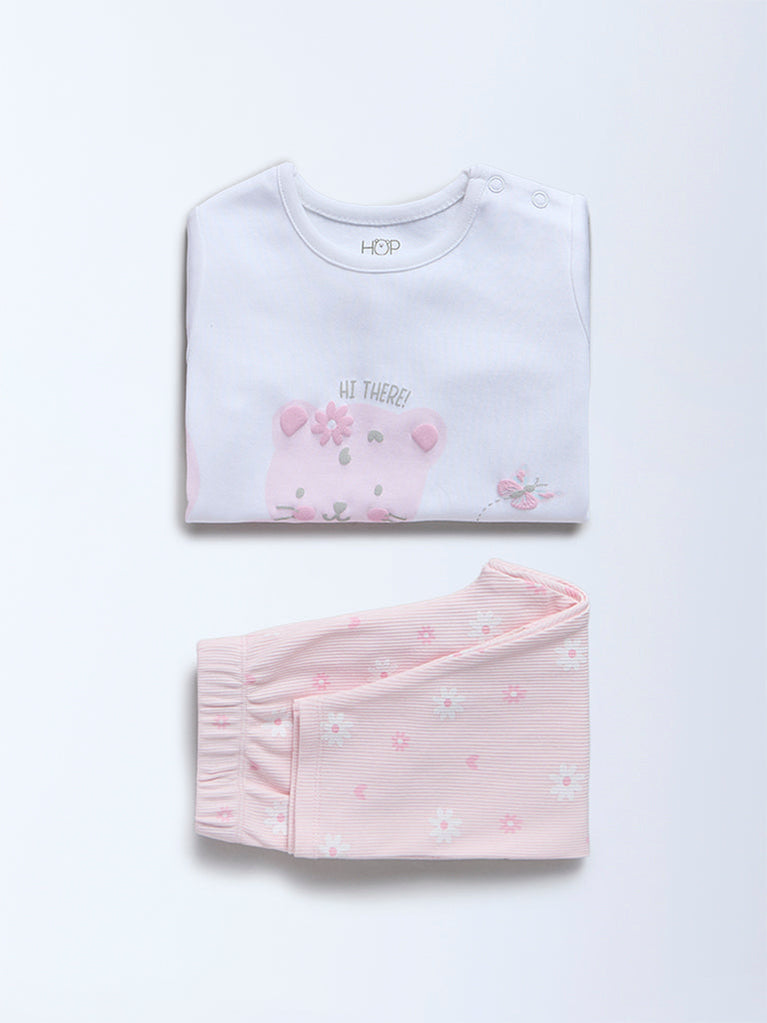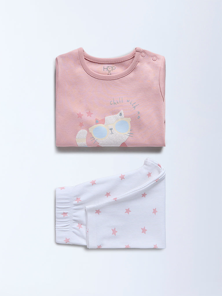 HOP Baby Light Pink Cat Printed Cotton T-Shirt and Pants Set - Exclusive