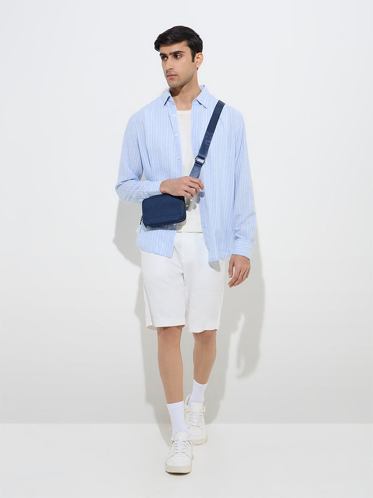 Ascot unveils this light blue shirt, adorned with a timeless pinstriped pattern. Crafted from a luxurious linen-blend fabric, this relaxed-fit garment features a semi-spread collar, a button-down front, and full sleeves with buttoned cuffs for a polished finish.