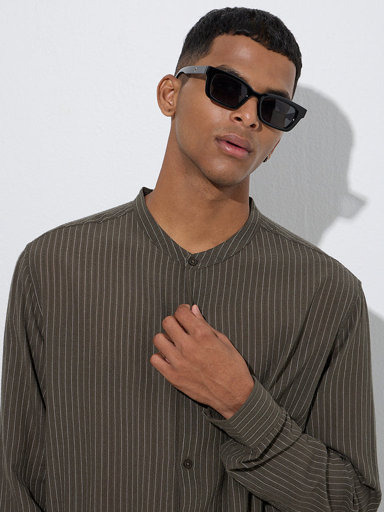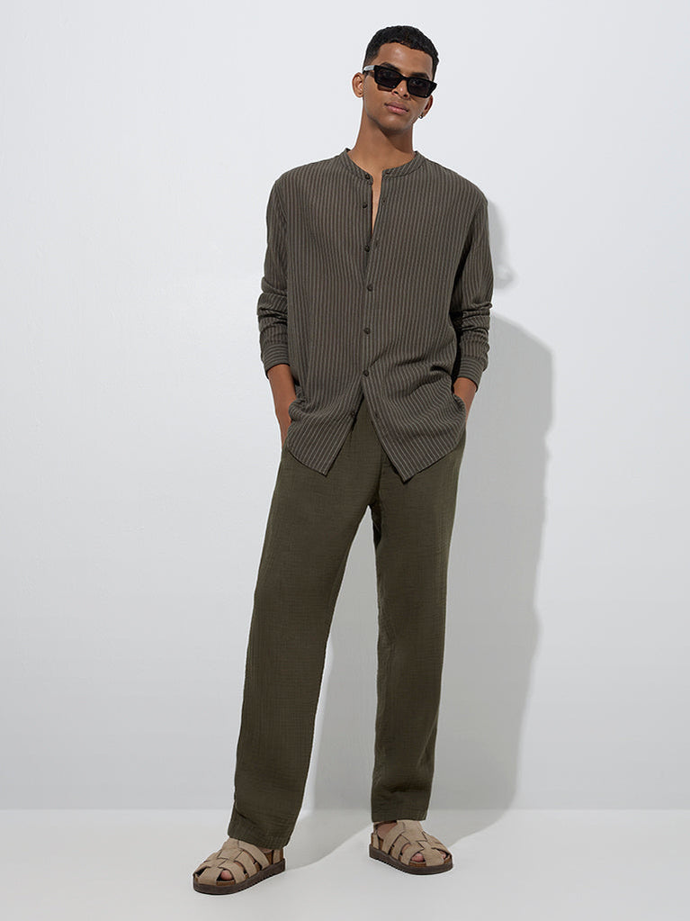 Sculpted in a relaxed frame, this olive shirt from ETA is created from a lightweight fabric and detailed with stripe prints. Finished with a band-neck collar, button placket, and full sleeves, it offers a refined look ideal for smart-casual settings.