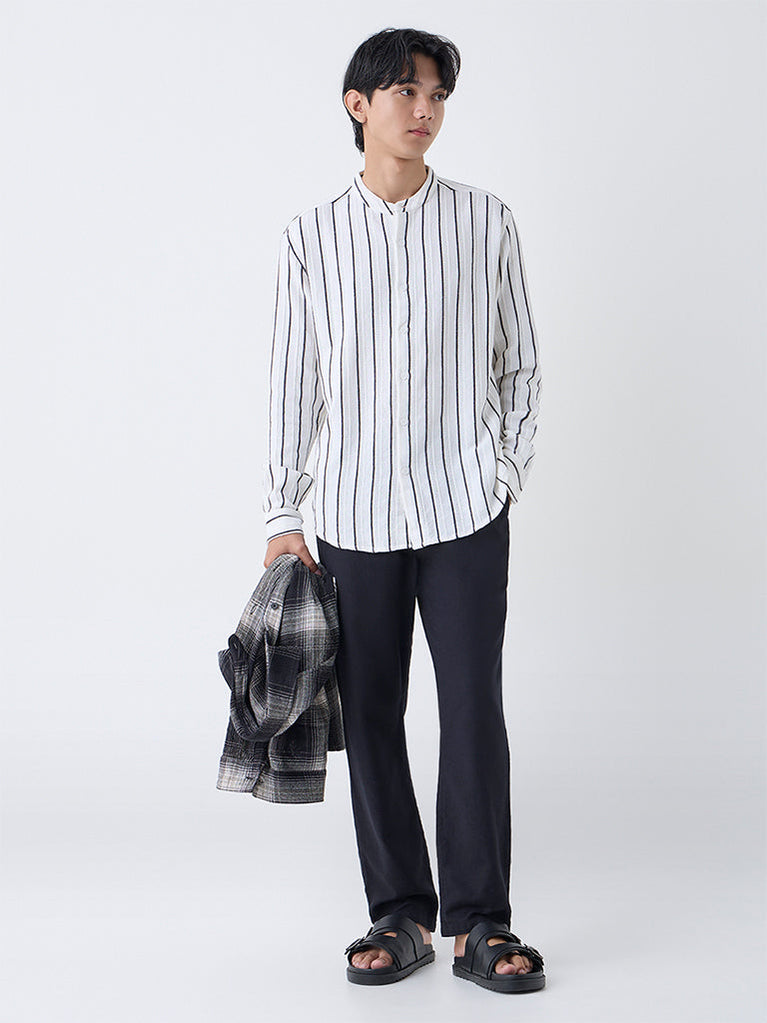 Stay cool and effortlessly stylish with this off-white striped shirt from ETA. Crafted from breathable cotton with a textured weave, it ensures a crisp feel throughout the day. Designed with a classic mandarin collar and full sleeves, this shirt offers a relaxed yet smart silhouette, making it the perfect choice for off-duty looks.
