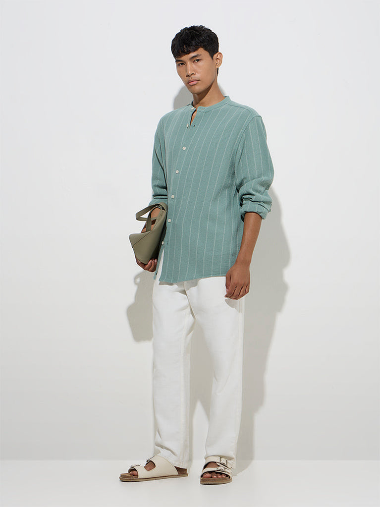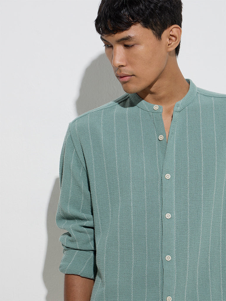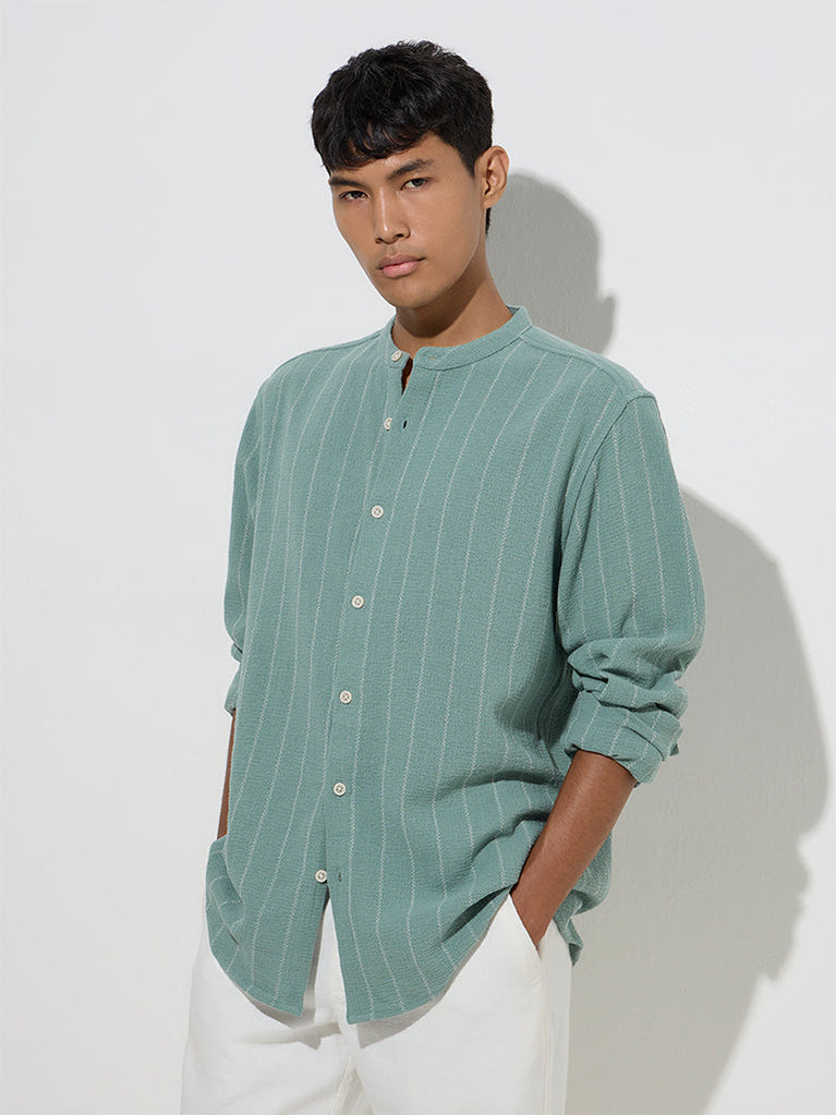 This sage striped shirt from ETA brings a fresh take to everyday dressing. Crafted from pure cotton, it features a resort fit with white vertical stripes, a band collar, full sleeves, and a button-down front — perfect for an easy, laid-back look.