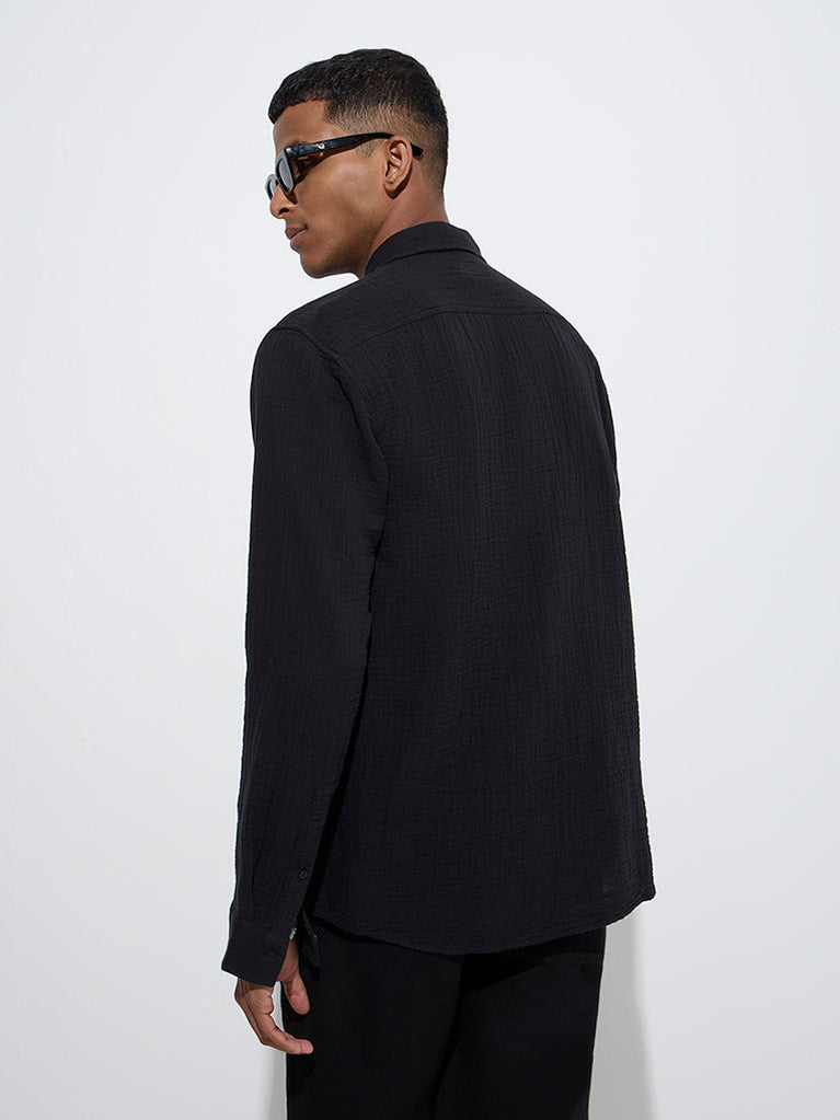 Crafted from a crinkle-textured fabric, this black shirt from ETA offers breathable comfort with a subtly textured vibe. It is shaped in a relaxed silhouette, featuring a classic collar, a button placket and full sleeves with buttoned cuffs.