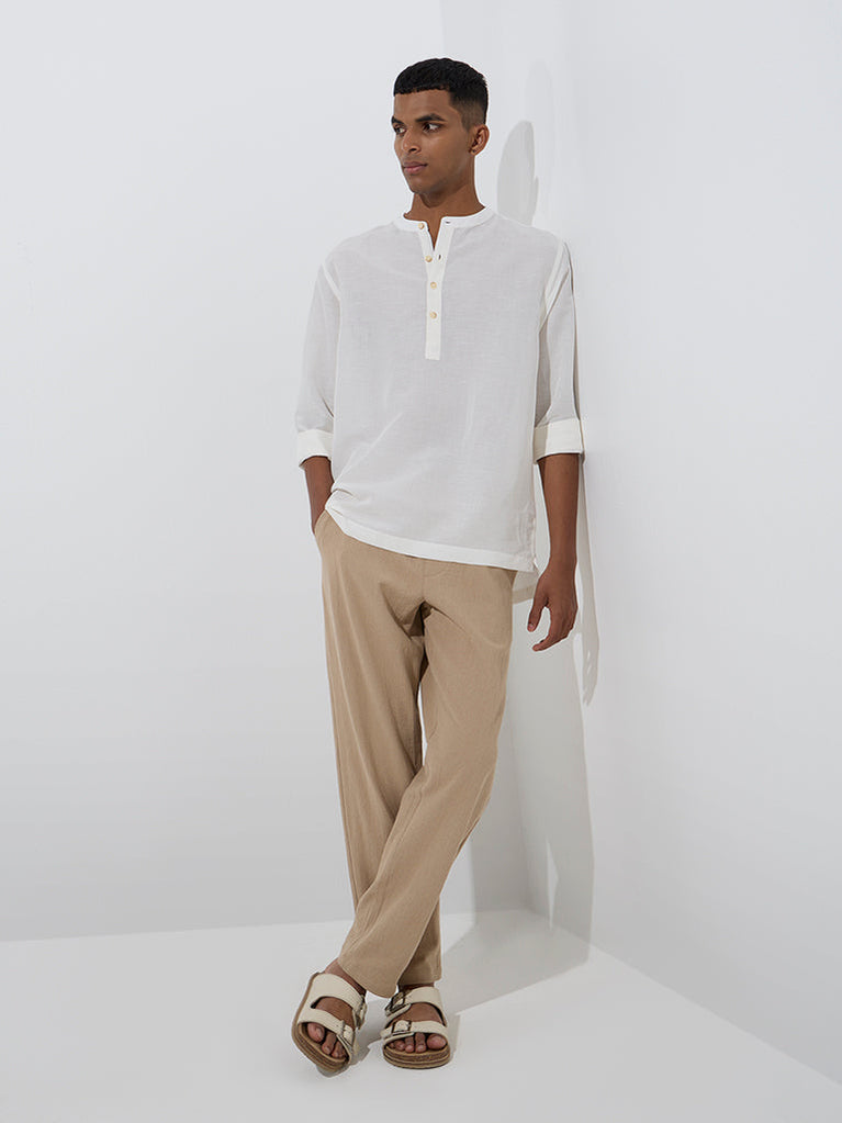 ETA introduces effortless sophistication with this off-white shirt, tailored in a relaxed fit for everyday ease. Designed with a band-neck collar, button placket, and full sleeves, it is woven from a sumptuous linen-blend fabric for elevated comfort.