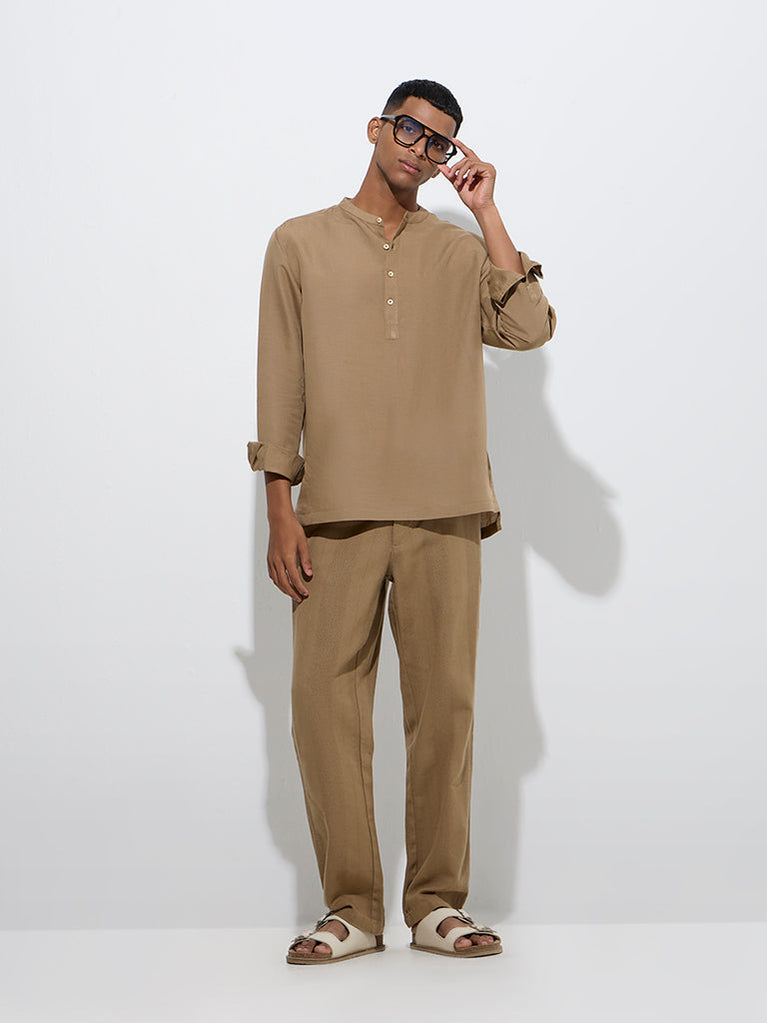 This taupe shirt from ETA is a refined take on everyday dressing. Tailored in a relaxed silhouette, it features a band-neck collar, a button placket, and full sleeves for a clean, modern look. Created from a premium linen-blend fabric, it offers all-day comfort with a polished edge.