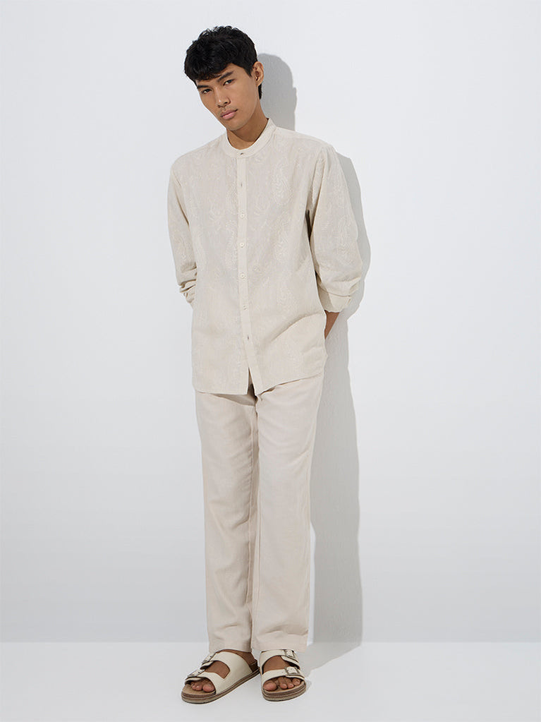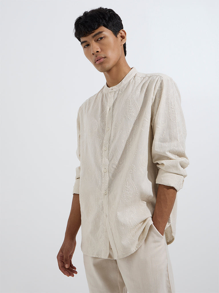 Elevate your everyday wardrobe with this beige shirt from ETA. Adorned with delicate paisley embroidery, it’s tailored from pure cotton in a relaxed fit. The band collar, button placket, and full sleeves complete its effortlessly refined appeal.
