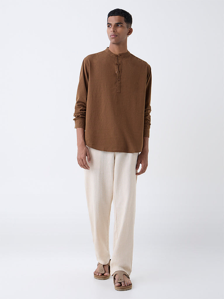 Easy days call for effortless style, and this brown self-patterned shirt from ETA fits right in. Crafted from a soft cotton blend, it features a relaxed fit and band collar that lend a breezy, modern edge. The subtle texture adds quiet depth, while the full sleeves make it ideal for laid-back evenings or café strolls by the coast.