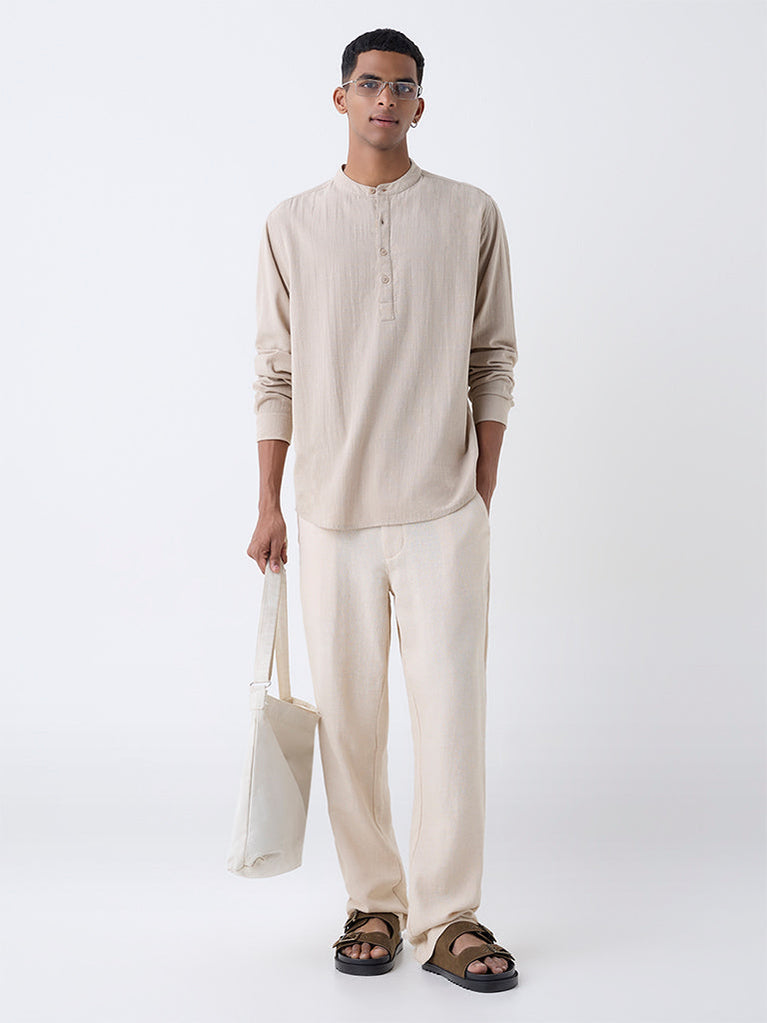 Bring effortless sophistication to your wardrobe with this beige shirt from ETA. Shaped in a relaxed silhouette, it features a band collar, a short button-up front and full sleeves. Spun from a breathable fabric with a textured finish, it serves as a versatile staple for refined occasions.