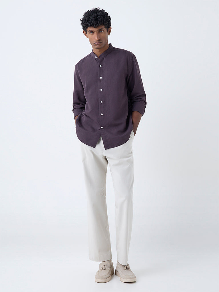 Modern refinement meets quiet luxury in this dark purple shirt from Ascot. Carved in a relaxed frame from a premium linen-blend, it is styled with a mandarin-collar, button-up front and full sleeves. A versatile piece that transitions effortlessly across smart-casual occasions.