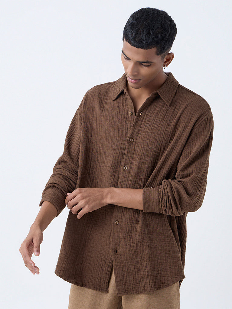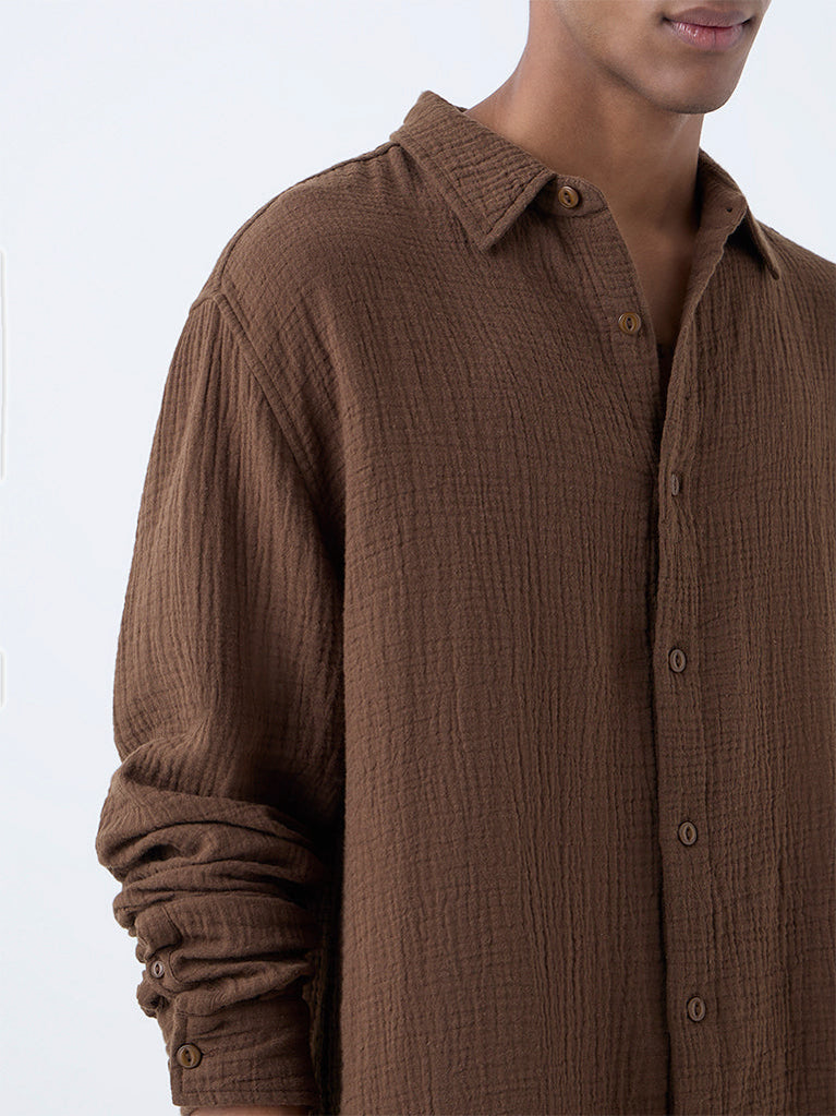 ETA Brown Crinkle-Textured Relaxed-Fit Cotton Shirt