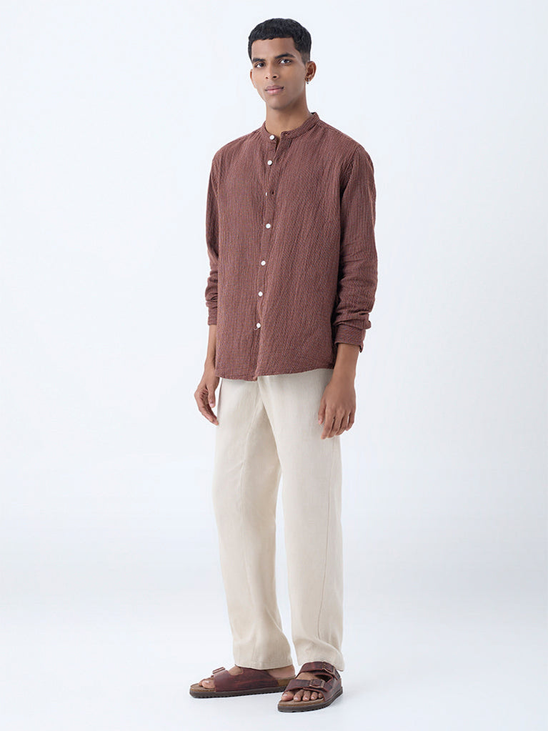 Casual days get a subtle style upgrade with this brown striped shirt from ETA. Crafted from breathable cotton in a relaxed fit, it features soft tonal stripes, a band-neck collar, button placket, and full sleeves.