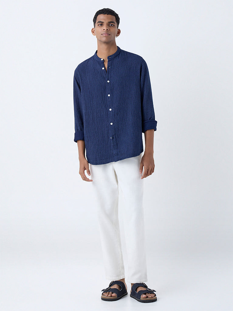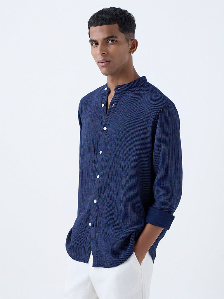 Smart, effortless, and versatile, this indigo striped shirt from ETA is crafted from breathable cotton for all-day comfort. The relaxed fit, band collar, button-down front, and full sleeves give it a refined yet easy-going edge. Ideal for pairing with chinos or denim, it’s a go-to off-duty staple for casual city style.
