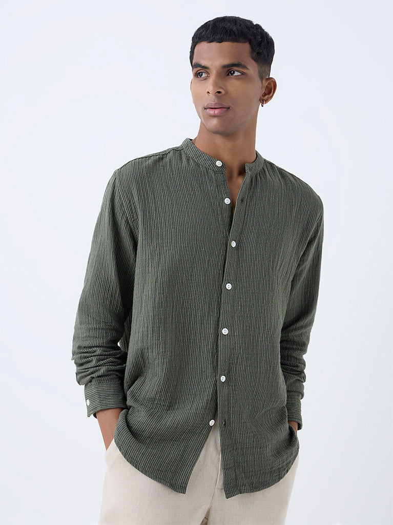 Keep it simple and stylish with this olive striped shirt from ETA. Made from breathable cotton in a relaxed frame, it features a band collar, button-down front, and full sleeves.