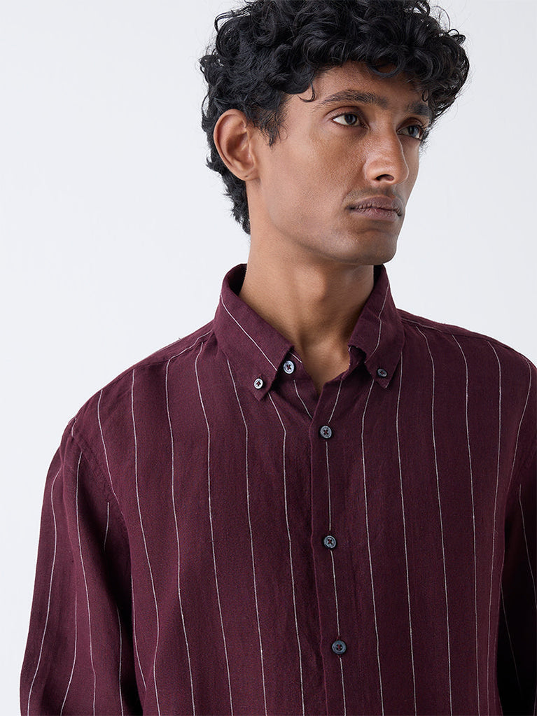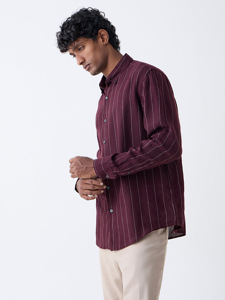 Ascot Wine Striped Relaxed-Fit Linen Shirt