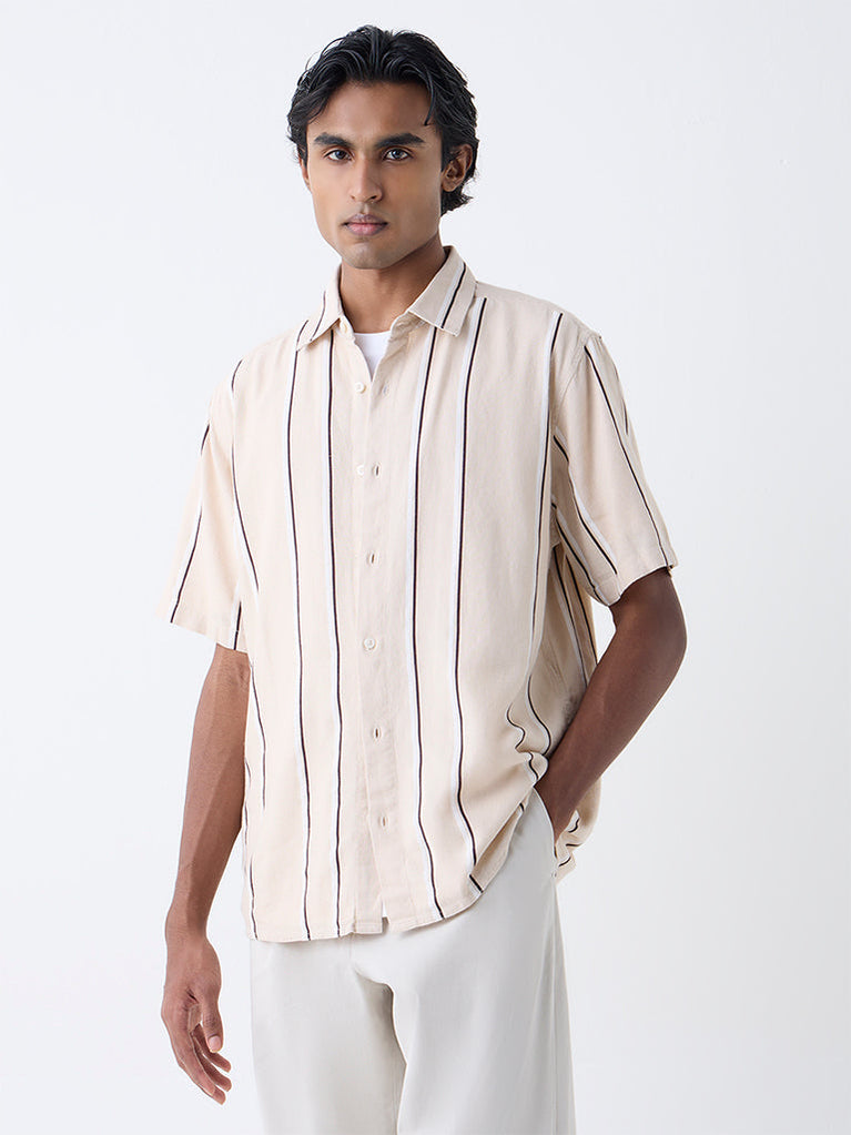 Ascot brings this beige shirt featuring striking stripe print on a relaxed frame. Woven from a soft, breathable fabric, it is framed with a semi-spread collar, a button-up front and short sleeves.