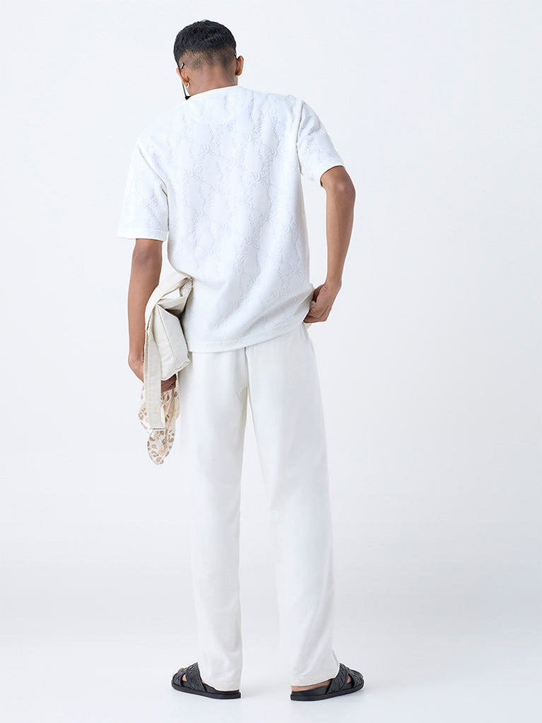This white t-shirt from ETA is styled in a relaxed frame with a round neck and short sleeves for everyday ease. Crafted from breathable fabric, it is enhanced with all-over botanical textures that brings character to the look. Designed for comfort with an understated finish, it makes a contemporary addition to casual wardrobes.