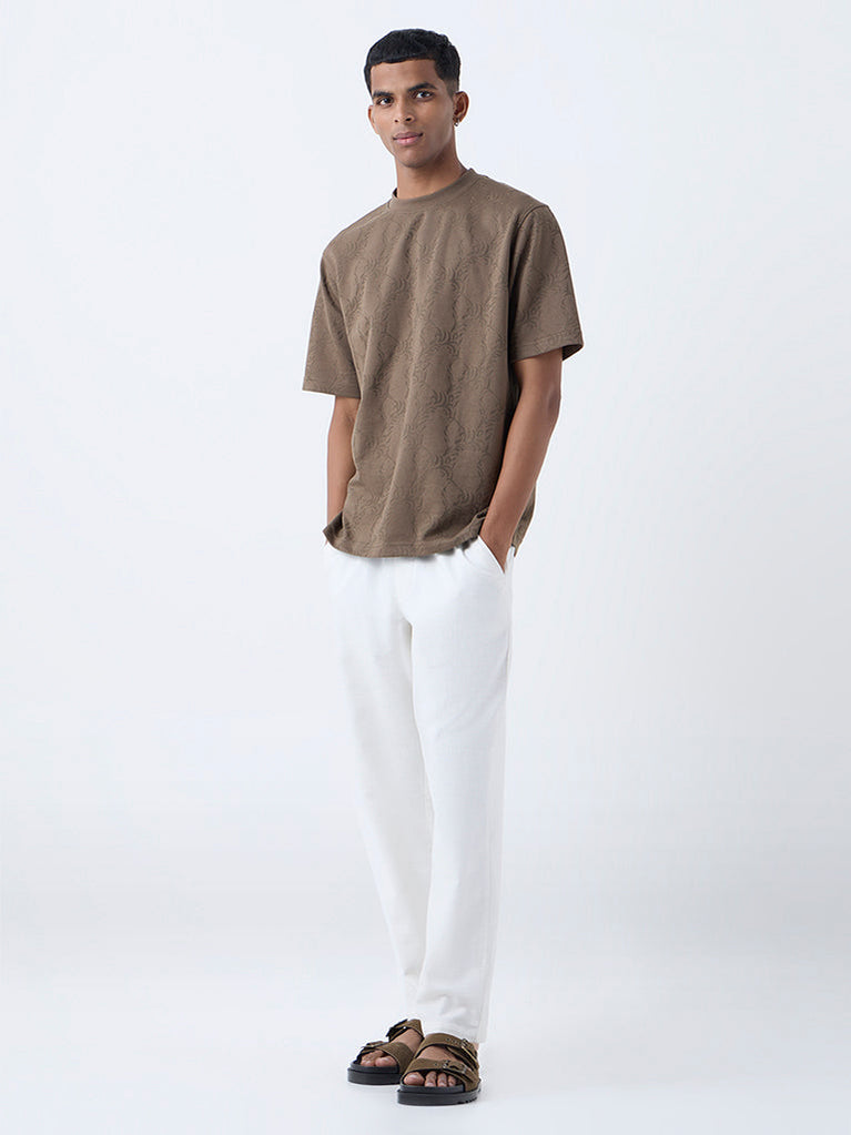 Ascot Tan Self-Striped Relaxed-Fit Cotton-Blend T-Shirt