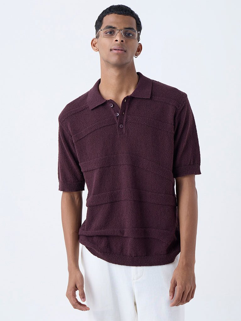 ETA Maroon Self-Striped Relaxed-Fit Cotton Polo T-Shirt
