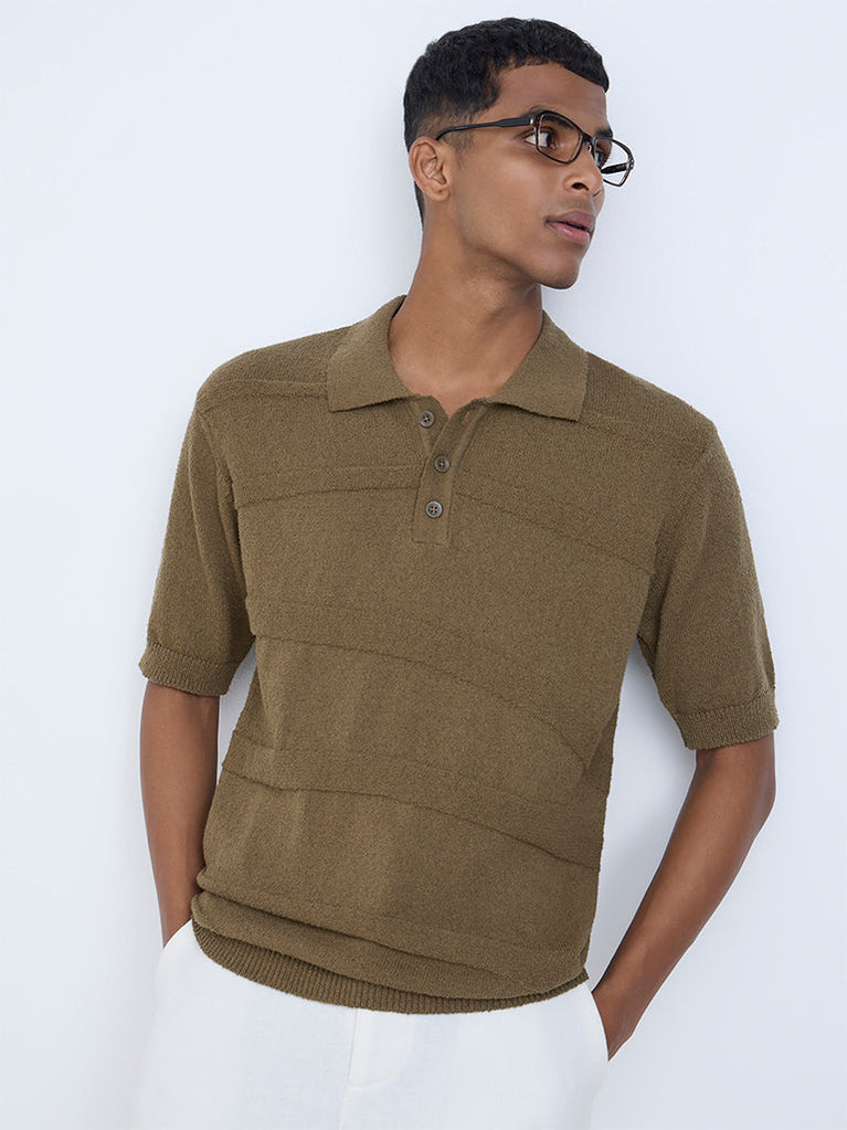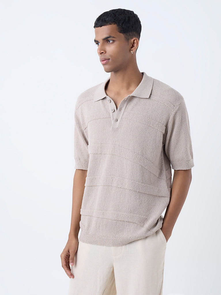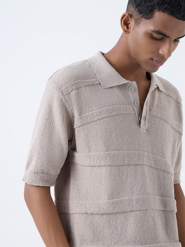ETA Taupe Knit-Textured Relaxed-Fit Cotton Polo T-Shirt