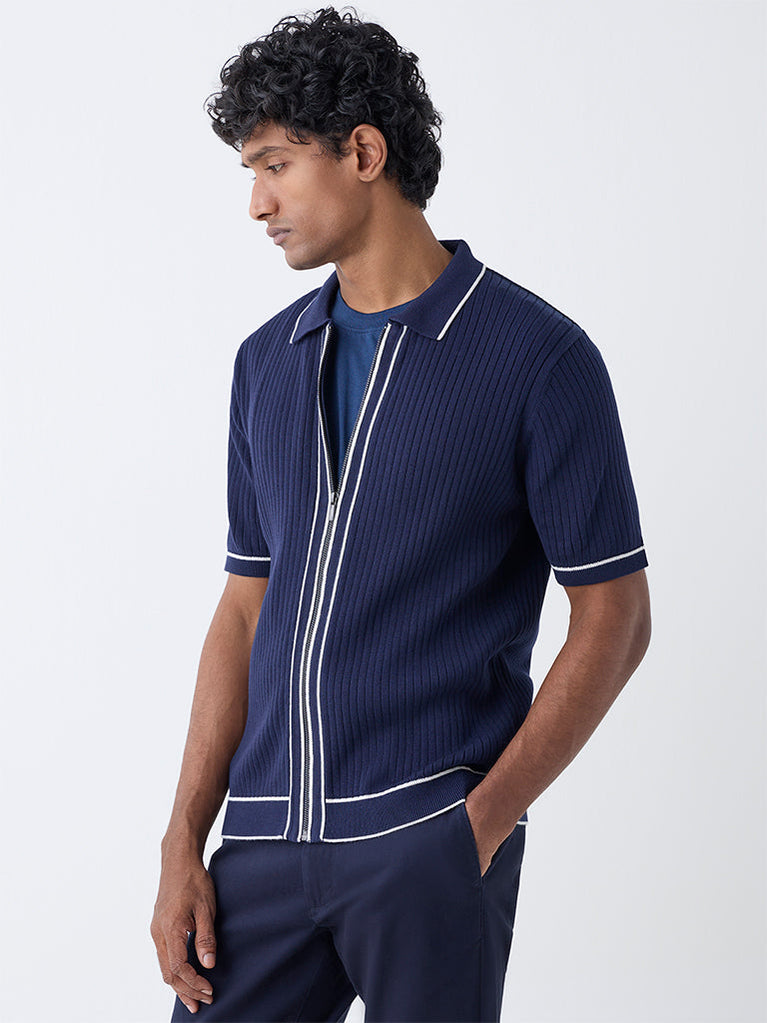 Refine your casual lineup with this navy t-shirt from Ascot. Designed with a spread collar and full zip placket, it’s tailored from a soft cotton-blend fabric in a relaxed fit. White stripe accents at the collar, cuffs and zip lend a sporty yet sophisticated edge.
