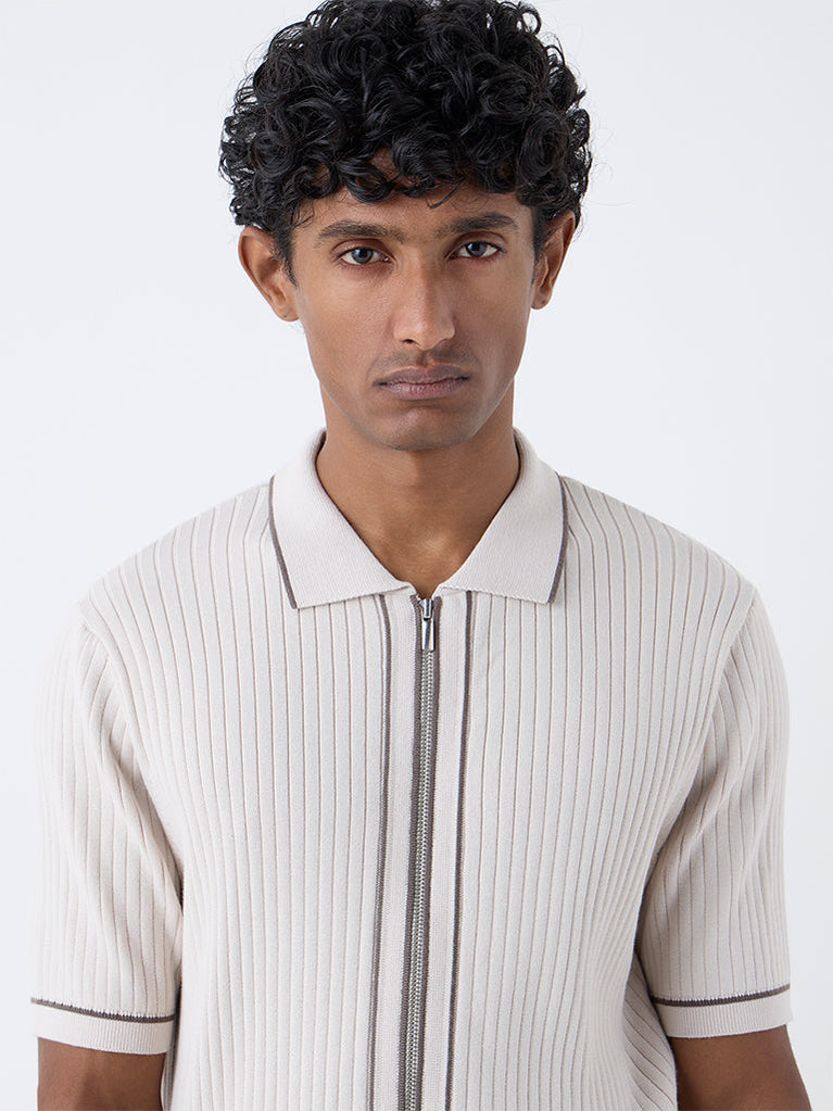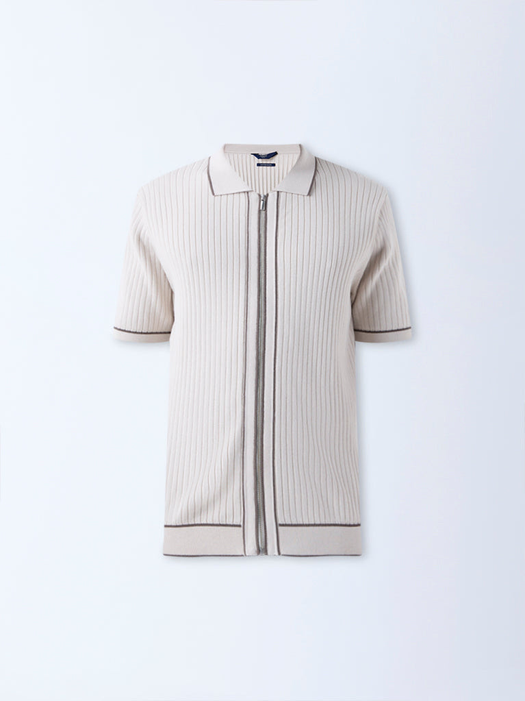 Ascot introduces this beige t-shirt, tailored from a luxurious-blend fabric with a self-striped texture. Framed in a relaxed shape, it features a spread collar, zipper front and short sleeves. The design blends polish with an easy-going attitude for everyday refinement.