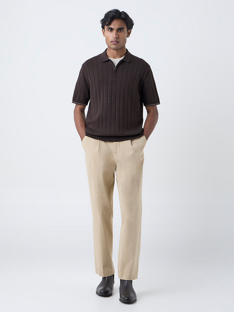 Ascot presents this dark brown polo t-shirt, defined by itself-striped texture over a premium-blend fabric. The relaxed frame, spread collar, zipper front and short sleeves combine comfort with structure. Designed for ease and polish, it complements both tailored and off-duty pairings effortlessly.