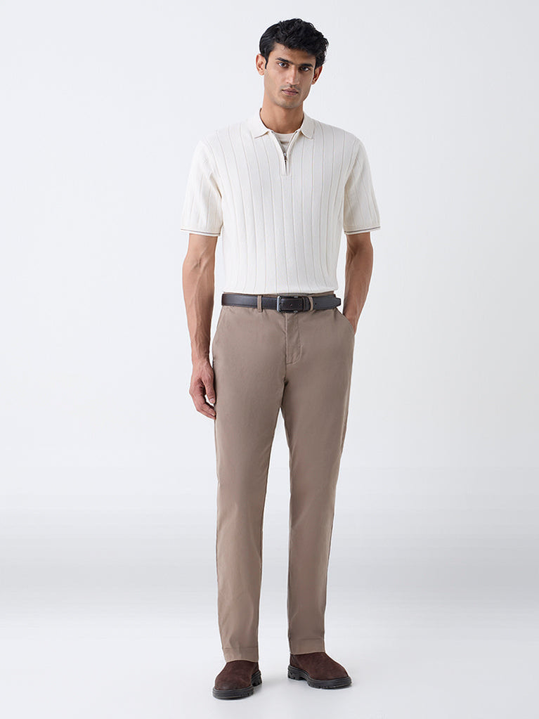 This beige polo t-shirt from Ascot redefines casual polish with its cable-knit finish and clean construction. Spun from a cotton-rich fabric, it’s cut in a relaxed silhouette and styled with a polo collar, short button placket, and half sleeves.