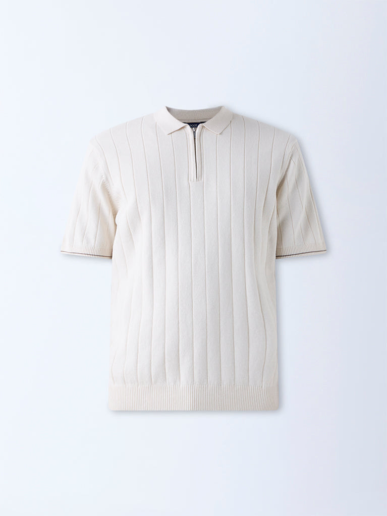This off-white polo t-shirt from Ascot is crafted from a soft cotton-blend fabric and refined with a modern quarter-zip collar that adds a contemporary edge. The ribbed texture introduces subtle structure, while the short sleeves keep the silhouette clean and versatile.
