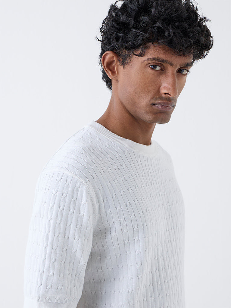 Ascot White Cable Knit Relaxed-Fit Cotton T-Shirt
